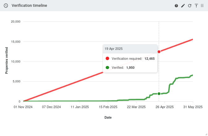 This chart shows cumulative counts of verified properties between two specific dates against a linear schedule for verification of properties. Properties with a tag that is marked as PIDs with this tag require verification are the only properties included in both the schedule count and cumulative verified line.