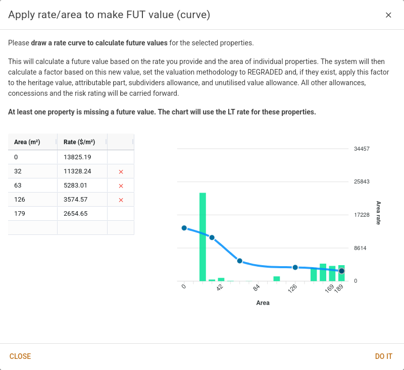 Apply rate/area to make FUT value (curve) | This will calculate a future value based on the rate you provide and the area of individual properties. The system will then calculate a factor based on this new value, set the valuation methodology to REGRADED and, if they exist, apply this factor to the heritage value, attributable part, subdividers allowance, and unutilised value allowance. All other allowances, concessions and the risk rating will be carried forward. ![]() |