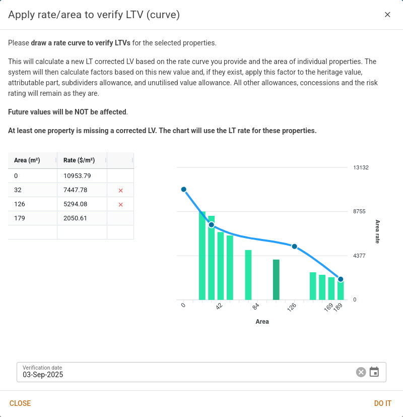Apply rate/area to verify LTV (curve) | This will calculate a new LT corrected LV based on the rate curve you provide and the area of individual properties. The system will then calculate factors based on this new value and, if they exist, apply this factor to the heritage value, attributable part, subdividers allowance, and unutilised value allowance. All other allowances, concessions and the risk rating will remain as they are. LT values will be flagged as verified at the date provided. ![]() |