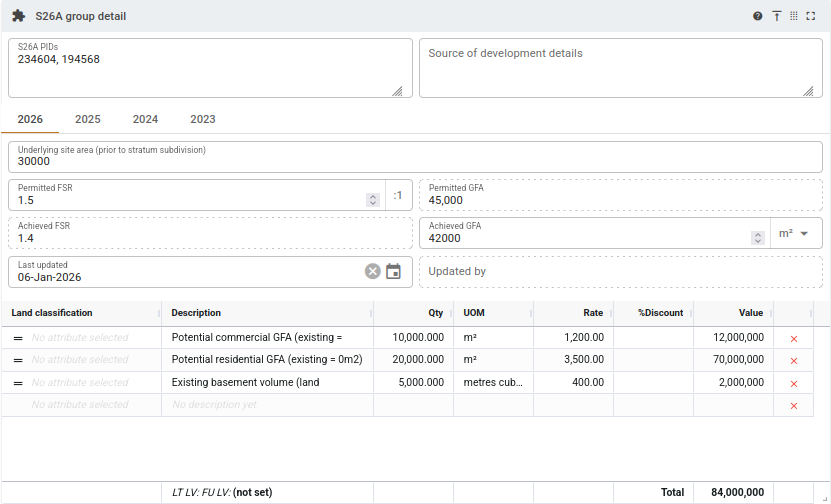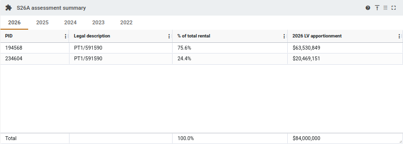 This panel provides a read-only overview of the apportionment values for each of the PIDs in a section 26A related group. Each row includes a PID, the legal description, the rental percentage with respect to the related group, and the apportioned value of the PID for the selected year. Years can be selected with the tabs at the top, and the apportionment percentages will calculate based on that years' rental calculations and total value.