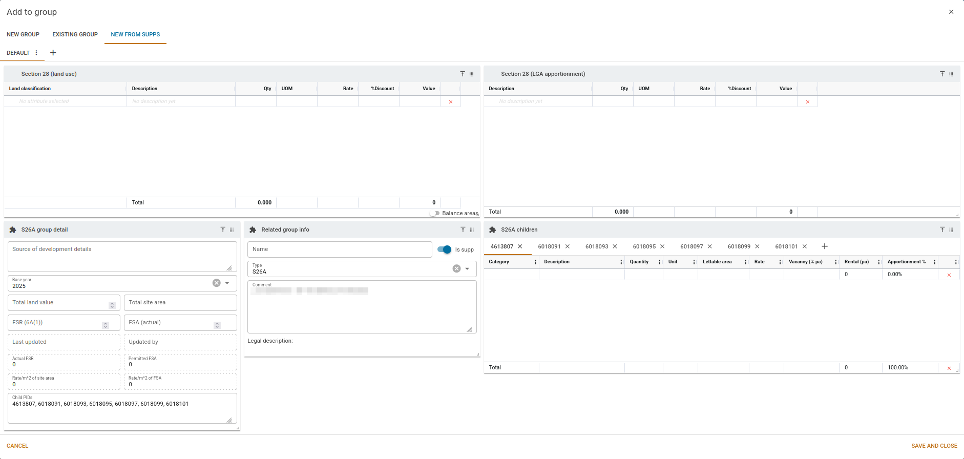 If the property or supp is part of an S26A related group, this panel allows you to edit parent-level information about the group. Any field that you specify here is shared between all of the PIDs in the related group.
